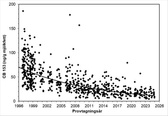 Figur 1. PCB 153. Varje punkt i figuren motsvarar halten PCB 153 i ett enskilt modersmjölksprov. Regressionslinjen visar tidstrenden, justerad för mammans ålder, BMI, viktuppgång under graviditeten och viktnedgång efter förlossningen. Medelhalten av PCB 153 i modersmjölk minskade med 6,0 % per år under perioden 1996–2024.