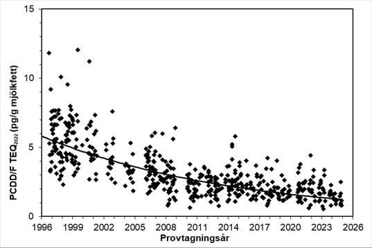 Figur 2. PCDD/F TEQ2022 (dioxiner). Varje punkt i figuren motsvarar halten PCDD/F TEQ2022 i ett enskilt modersmjölksprov. Regressionslinjen visar tidstrenden, justerad för mammans ålder, BMI, viktuppgång under graviditeten och viktnedgång efter förlossningen. Medelhalten av PCDD/F TEQ2022 i modersmjölk minskade med 5,2 % per år under perioden 1996-2024.