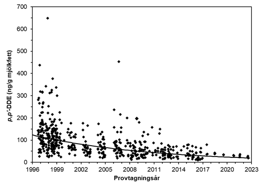 Figur 3. p,p´-DDE. År 1996–2016 motsvarar varje punkt i figuren halten p,p´-DDE i ett enskilt modersmjölksprov. År 2017–2022 motsvarar varje punkt i figuren halten p,p´-DDE i ett poolat modersmjölksprov (tre pooler/år). Varje pool består av 10 enskilda slumpmässigt utvalda modersmjölksprov. Regressionslinjen visar tidstrenden, justerad för mammans ålder, BMI, viktuppgång under graviditeten och viktnedgång efter förlossningen. Medelhalten av p,p´-DDE i modersmjölk minskade med 6,7 % per år under perioden 1996–2022.