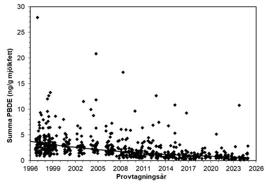 Figur 4. Summa PBDE. Varje punkt i figuren motsvarar halten summa PBDE (summan av kongenerna BDE-47, 99, 100 och 153) i ett enskilt modersmjölksprov. Regressionslinjen visar tidstrenden, justerad för mammans ålder, BMI, viktuppgång under graviditeten och viktnedgång efter förlossningen. Medelhalten av summa PBDE i modersmjölk minskade med 6,1 % per år under perioden 1996–2024.