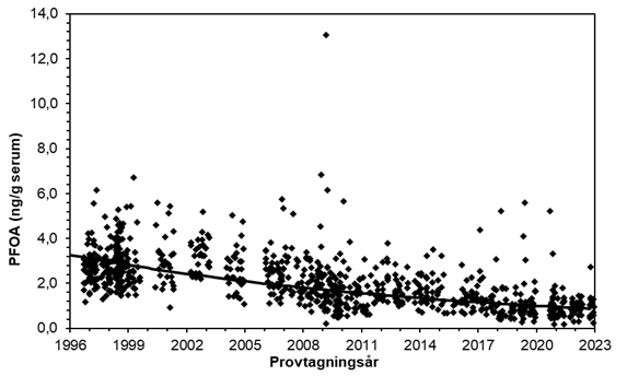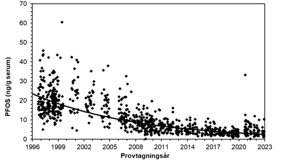 Beräknat utifrån linjär regression minskade medelhalten av PCB 153 med 6 procent per år och medelhalten av dioxiner med ca 5 procent per år, mellan åren 1996 och 2024. Medelhalten av p,p'-DDE minskade med 7 procent per år under perioden 1996–2022. För summahalterna av PBDE kan en nedåtgående trend på ca 6 procent per år utläsas mellan år 1996 och 2024. Halten av PFOS och PFOA i blod har minskat med ca 8 respektive 5 procent per år 1996–2022. Under samma tidsperiod har halterna av de långkedjiga PFAS (mätt som summan av PFNA, PFDA, PFUnDA) ökat med ca 3 procent per år under 1996–2012 och sedan minskat ca 4 procent per år under åren 2012–2022, även om halterna fortfarande är högre an vid startåret för mätningarna.