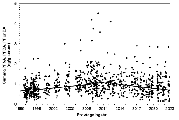 Figur 7. Summa PFNA, PFDA och PFUnDA. Varje punkt i figuren motsvarar halten av summan av 3 långkedjiga perfluorerade karboxylsyror i ett enskilt serumprov. Regressionslinjen visar tidstrenden, justerad för mammans ålder, BMI, viktuppgång under graviditeten och viktnedgång efter förlossningen. Medelhalten av summan av PFNA, PFDA och PFUnDA i serum ökade med 3,4 % per år 1996–2012 och minskade sedan med 3,7 % per år 2012-2022.