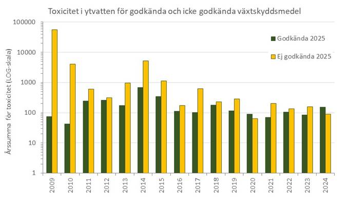 Figur 2. Summerad toxicitetför de fyra typområdena per år, uppdelat på godkända och icke godkända verksamma ämnen i växtskyddsmedel år 2025.
