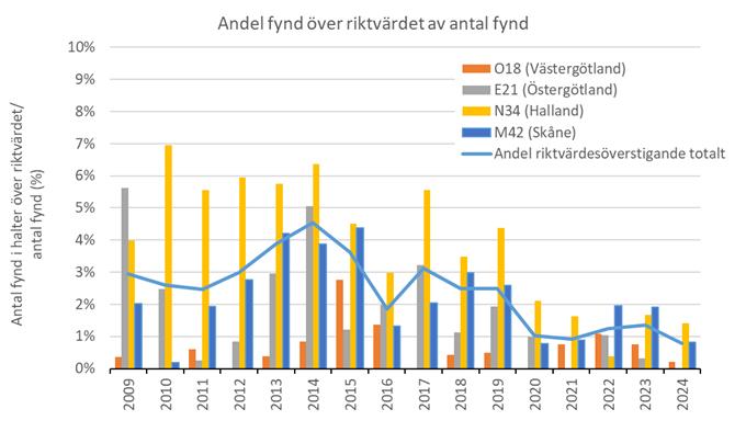 Om ett ämne påträffas över detektionsgränsen räknas det som ett fynd och om halten är över ämnets riktvärde ses det som ett fynd över riktvärdet. Figur 3 visar andelen av alla fynd i typområdena där halten av en ämne uppmäts över riktvärdet, oavsett storlek på överstigandet. Andelen riktvärdesöverstigande halter har minskat i slutet av perioden för alla typområden, en trend som är statistiskt signifikant. Typområdena i Västergötland och Östergötland har få, eller inga, överstiganden per år medan typområdet i Halland har flest.